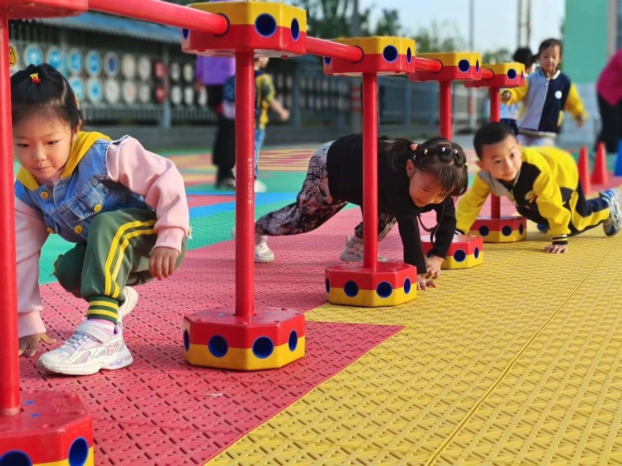 户外活动环节,全园幼儿参与的“运动方舟”体育大循环成为亮点。幼儿以班级为单位,在由平衡木、跨栏和钻洞洞等关卡组成的循环路线中挑战体能极限。园方教师介绍,该活动通过“情境化任务+阶梯式挑战”设计,既锻炼幼儿运动能力,更培养坚持、互助等学习品质。