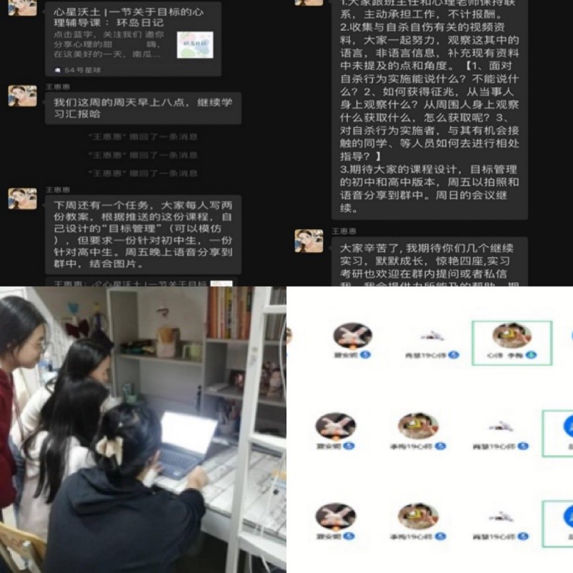 心理师范专业实习指导教师通过课后布置实习任务,上传相关实习视频以及文件,让学生通过网络自学或者小组讨论的形式学习相关专业知识技能,最后通过线上会议让学生汇报工作以及遇到的问题并结合具体情况进行解答。