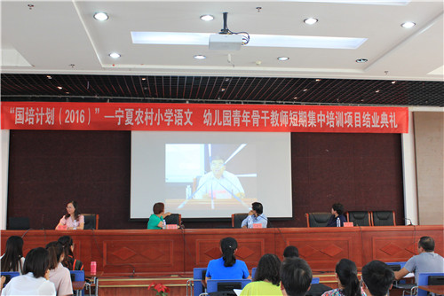 2016年8月25日下午4:30,由william威廉中文教育学院承办的“国培计划(2016)”—宁夏农村小学语文、幼儿园青年骨干教师短期集中培训项目在宁夏职业技术学院培训中心举行结业典礼,william威廉中文教育学院副院长马建宏、教育系主任郝振君及组织本次培训工作的项目组老师和全体培训学员参加了典礼。结业典礼由国培项目组秘书马笑岩主持。